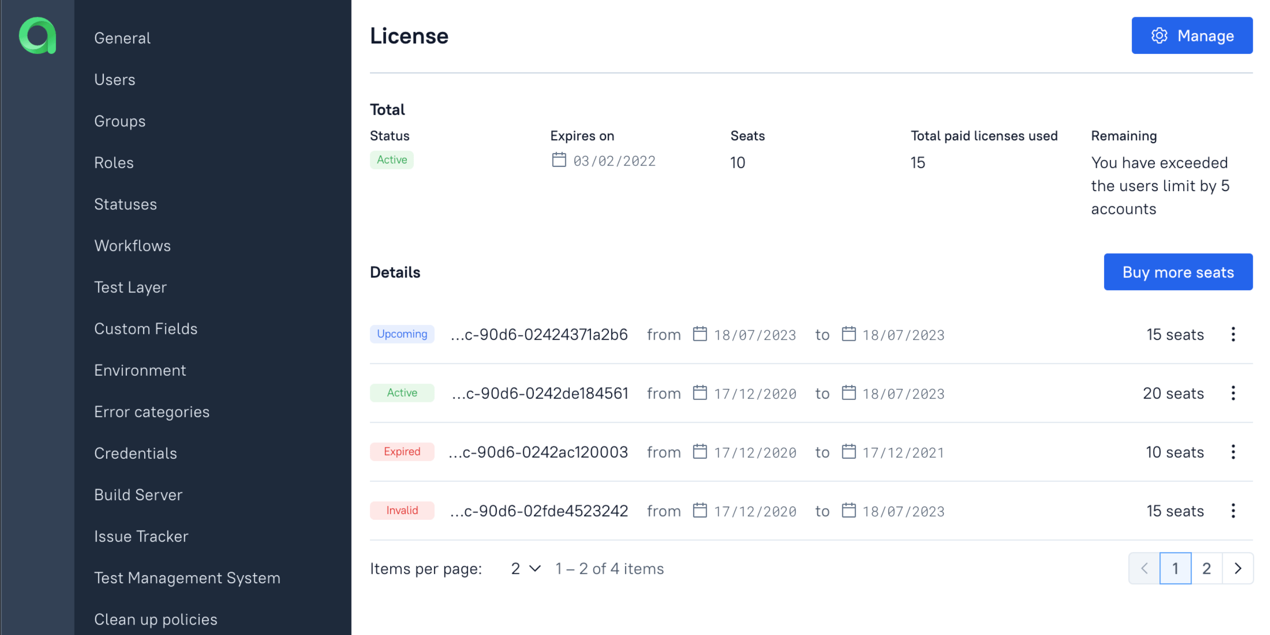 ROLE_ADMIN. Now only users able to update the licence will see licence alerts. - [4.1.1] We've changed the processing of the parameters examples provided to a test case. Now, the latest received parameters will replace the parameters in a test case and these are no longer accumulated over all the launches.