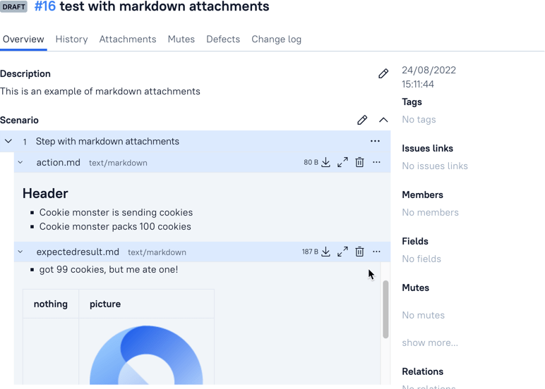 - Sections with actions and expected results now have a step-like structure within the test scenario. This allows adding attachments to both sections, as requested by many users.